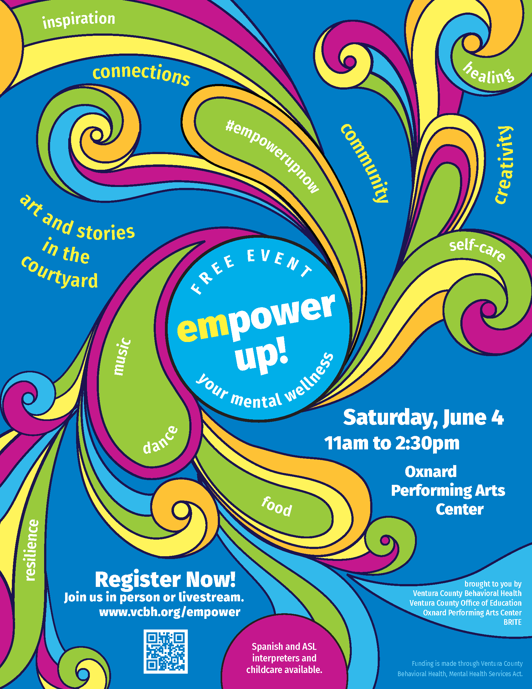 Dr. Jamie Rotnofsky, Mental Health Services Act Director for VCBH emphasizes the importance community plays in mental wellness and building resiliency. “We are a community, and together we can ensure that no one has to struggle alone. It is important to nurture our mental health by connecting with who we are, accepting where we are and directing our own lives. Connecting with others in a supportive, creative environment like the Empower Up! Event, is one way to begin this process.”